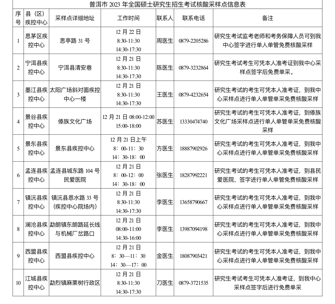 一、除在之前發(fā)布的《普洱市2023年全國碩士研究生招生考試考生告知書》中明確的核酸檢測點外,普洱市十縣區(qū)疾控中心也作為本次研考組考的定點檢測機構(gòu),于12月21日面向研考考生提供單人單管單采免費核酸采樣服務。十縣區(qū)核酸采樣點詳細信息及工作時間詳見附件(注:思茅區(qū)疾控中心僅為研究生考試監(jiān)考教師和考務保障人員提供核酸采樣服務)。