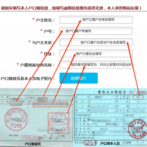特別提醒:為確保申請享受放寬政策人員報名信息審核通過,請按下列示例圖片填寫戶口簿信息。如有戶口簿毀損、手寫痕跡、字體不清、印章模糊等無法識別信息的情況,請盡快到戶籍地公安機關(guān)重新打印戶口簿,清晰拍照后上傳,避免耽誤報名。