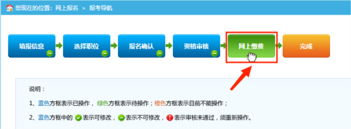 1.通過資格審查的報(bào)考者,點(diǎn)擊報(bào)考導(dǎo)航頁(yè)面“網(wǎng)上繳費(fèi)”按鈕進(jìn)入繳費(fèi)頁(yè)面。