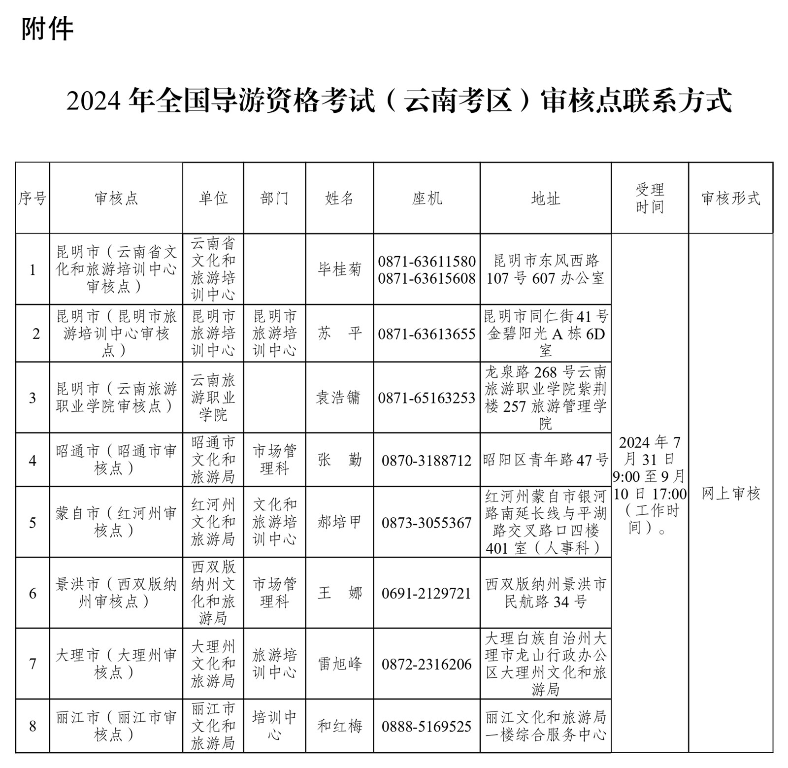 附件:2024年全國導(dǎo)游資格考試(云南考區(qū))審核點(diǎn)聯(lián)系方式