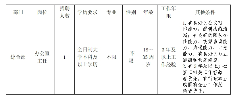為加強人才隊伍建設,優(yōu)化專技人員結(jié)構(gòu),結(jié)合公司工作實際,計劃公開招聘辦公室主任一職,為確保公開招聘工作順利進行,現(xiàn)將有關事項公告如下: