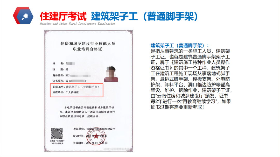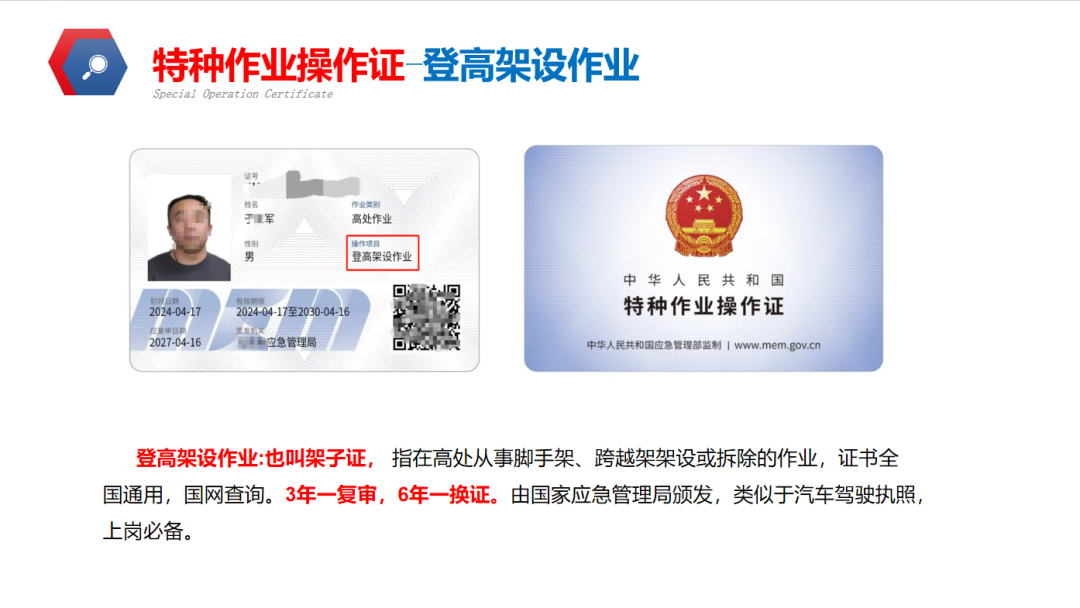 登高架設(shè)證:由應(yīng)急管理局頒發(fā),屬于特種作業(yè)操作證,全國聯(lián)網(wǎng)可查,3 年復(fù)審 1 次,6 年到期換證,逾期未審證書作廢。 建筑架子工證:由住建廳頒發(fā),屬于建筑施工特種作業(yè)資格證,2 年需完成繼續(xù)教育,主要用于建筑行業(yè)資質(zhì)審核與現(xiàn)場管理。 作業(yè)場景與范圍有別