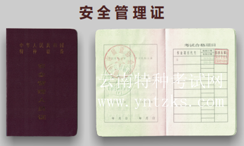 鍋爐、壓力容器、電梯、起重機(jī)械、客運(yùn)索道、場(chǎng)(廠)內(nèi)專用機(jī)動(dòng)車輛的管理人員統(tǒng) 稱為特種設(shè)備安全管理人員,代號(hào):A。證書全國(guó)通用,國(guó)網(wǎng)查詢。4年一復(fù)審,由昆明 市市場(chǎng)監(jiān)督管理局頒發(fā)。