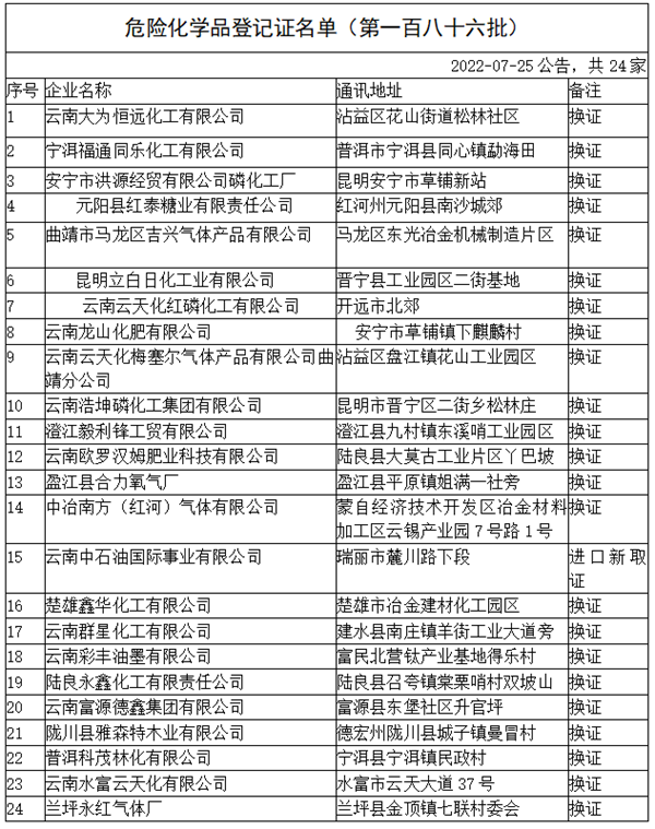 根據(jù)《危險(xiǎn)化學(xué)品安全管理?xiàng)l例》《危險(xiǎn)化學(xué)品登記管理辦法》有關(guān)規(guī)定,經(jīng)云南省危險(xiǎn)化學(xué)品登記中心初審、應(yīng)急管理部化學(xué)品登記中心審核合格,下列危險(xiǎn)化學(xué)品生產(chǎn)、進(jìn)口單位(共24家)取得《危險(xiǎn)化學(xué)品登記證》,現(xiàn)予以公告。