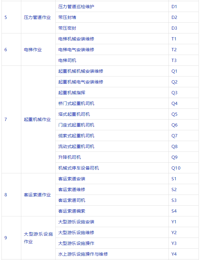 特種設(shè)備安全管理人員、叉車司機(jī)、起重機(jī)司機(jī)、起重機(jī)指揮、壓力容器、鍋爐、氣瓶充裝、電梯安裝與維修、觀光車、客運(yùn)索道操作與修理、大型游樂設(shè)施操作與維修等等。